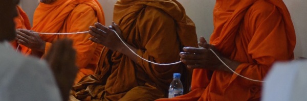 Ho partecipato a una inaugurazione gqualche tempo fa. I tre monaci buddhisti che officiavano la benedizione hanno passato un filo che partiva dalle loro mani e passando per le mani di tutti i partecipanti tornava a loro. Il filo ad un certo punto attraversava un corridoio tra due gruppi di persone ed era u a terraced: mi ha colpito il fatto che chiunque passasse di lì faceva le contorsioni per passarci sotto, piuttosto che scavalcarlo. E’ una forma di rispetto, mi hanno detto: quel filo ocyugf la Vita ed i rapporti tra le persone, non bisogna mai prevaricare queste cose.