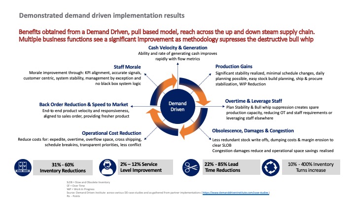 Infine, il punto di vista finanziario: uno dei benefici principali – più precisamente il risultato di tutti i benefici indotti dall’applicazione – del DDMRP è quello di contribuire alla massimizzazione del ROI, e di contribuirvi in maniera quasi diretta, mettendo il DDMRP come un argomento molto attraente per un CFO, o meglio diventando uno strumento necessario per supportare il raggiungimento degli obiettivi di un CFO. L’obiettivo di un modello operativo Demand Driven è quello di proteggere e promuovere il flusso di materiali e informazioni pertinenti, basandosi sulla legge di Plossl (George Plossl, uno dei padri del MRP che ha rivoluzionato la gestione della Supply Chain 50 anni fa): “tutti i benefici sono direttamente legati alla velocità del FLUSSO dei materiali e delle informazioni (pertinenti)”. Questa è la chiave: #thinkflow!